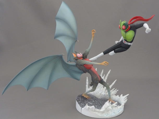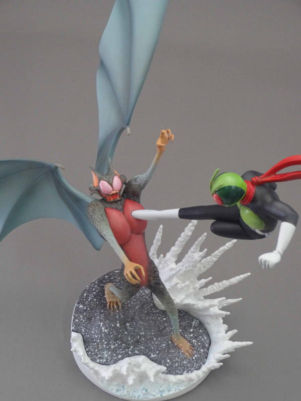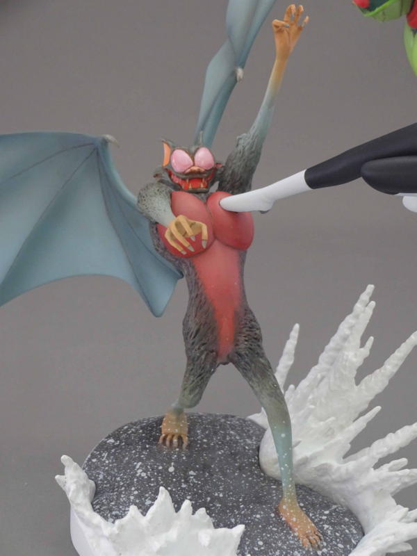 スケールは1/15。コウモリ男の翼はポリエステル樹脂製で、他はレジン、ポリエステルパテ、エポキシパテ等で作りました。