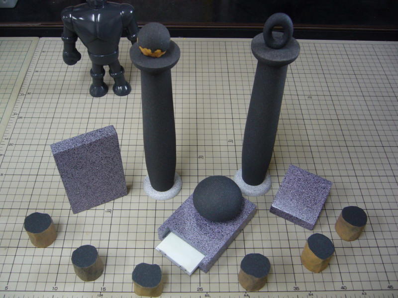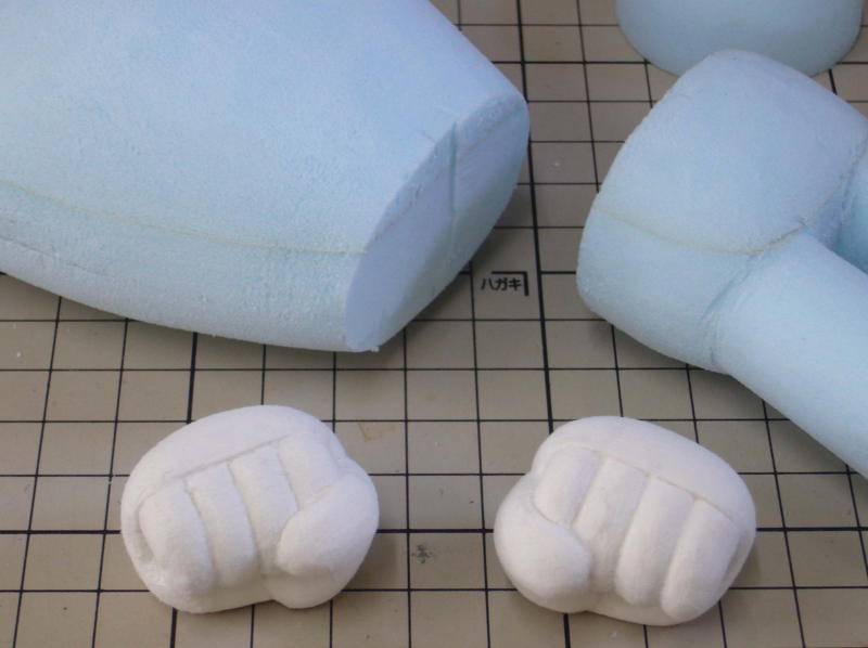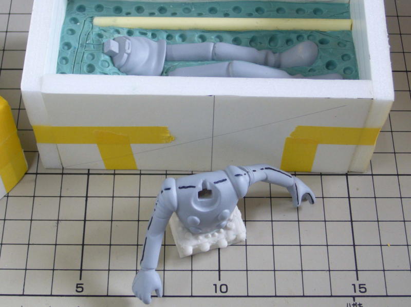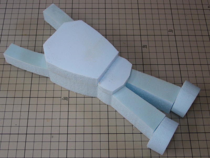右手を作って、それを参考に左手を作ってます。ロボットだし、ポーズも左右対称なのでサイズやバランスに、そこそこ気を使っての作業です。 スタイロホーム製の本体は、カッターと紙やすりで成形後、お腹の断面の形を確認するためにカットしてます。 |