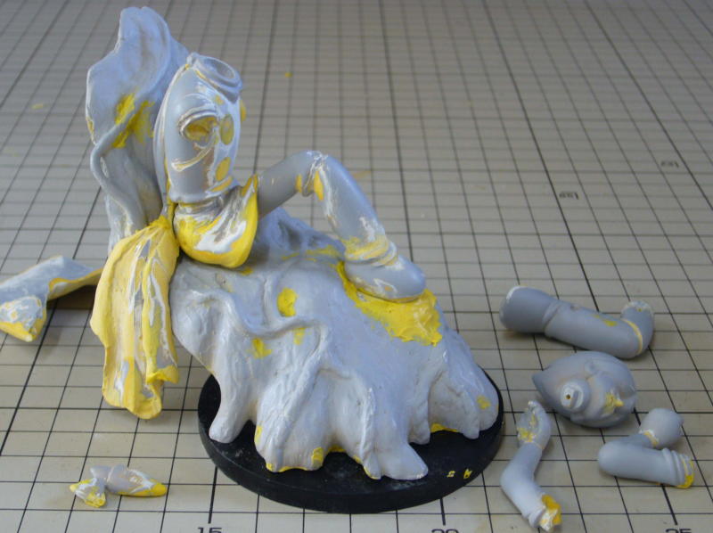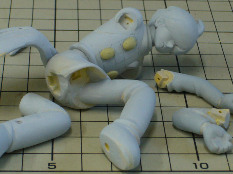 イラスト通りの配色だと塗り分けの必要が無い防護服とマフラーを一体にしようか迷ってますが、現在パーツ数は10個。 形は出来たので表面を仕上げていきます。 |