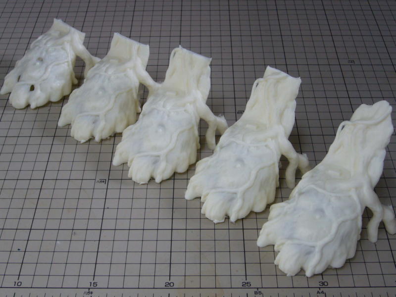 まずは樹木から。 1個目(左奥)はレジンの厚みが足りないところがあったのでそこをくり抜き検証後、シリコン型を修正。また、上部にレジンが届いてくれないので、湯口や空気抜きを修正しました。 5個目でやっと成功です。 |