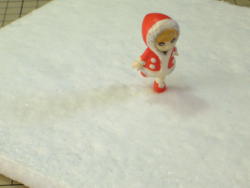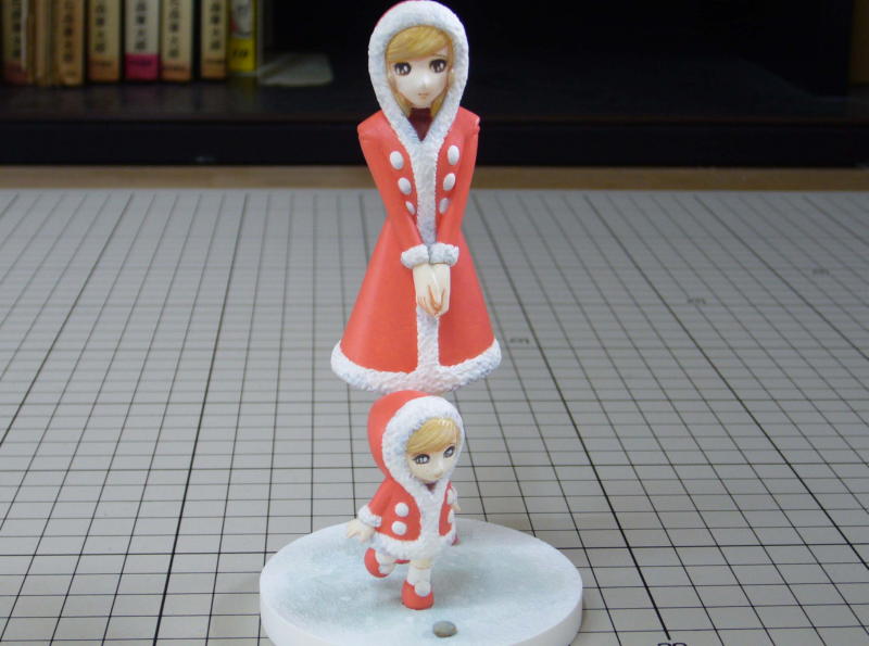コートは「赤いコート」と言えるくらいに赤みを強く調色しました。 何度も何処かへ飛んでいってしまった小石を無事見つけ出し、台座に接着して完成。 |