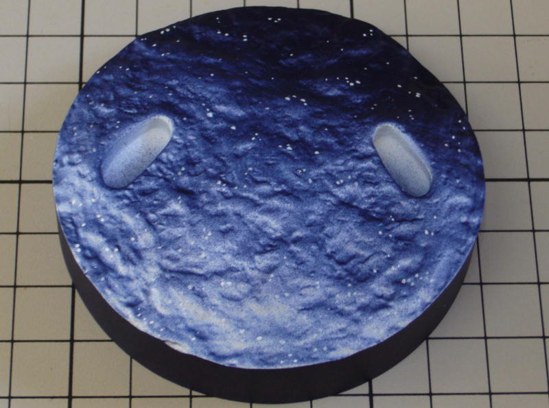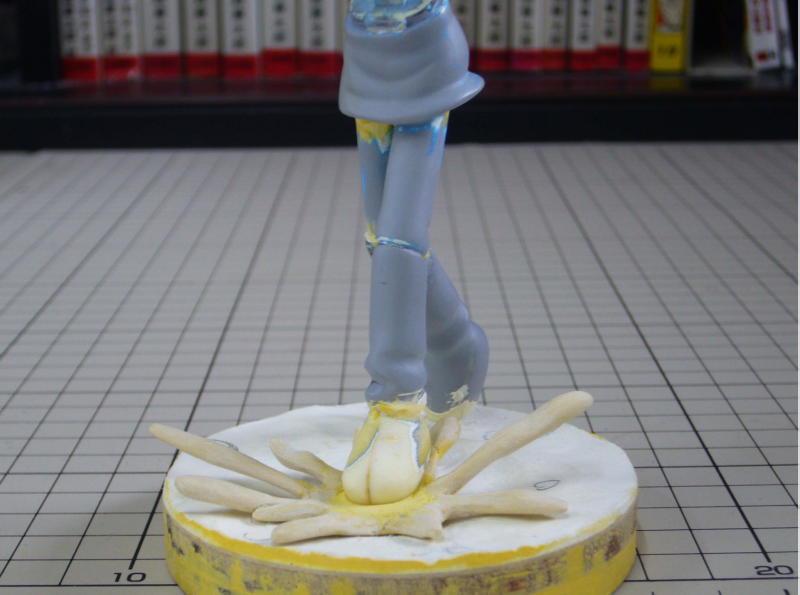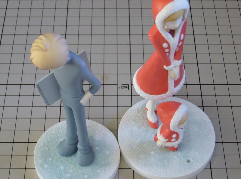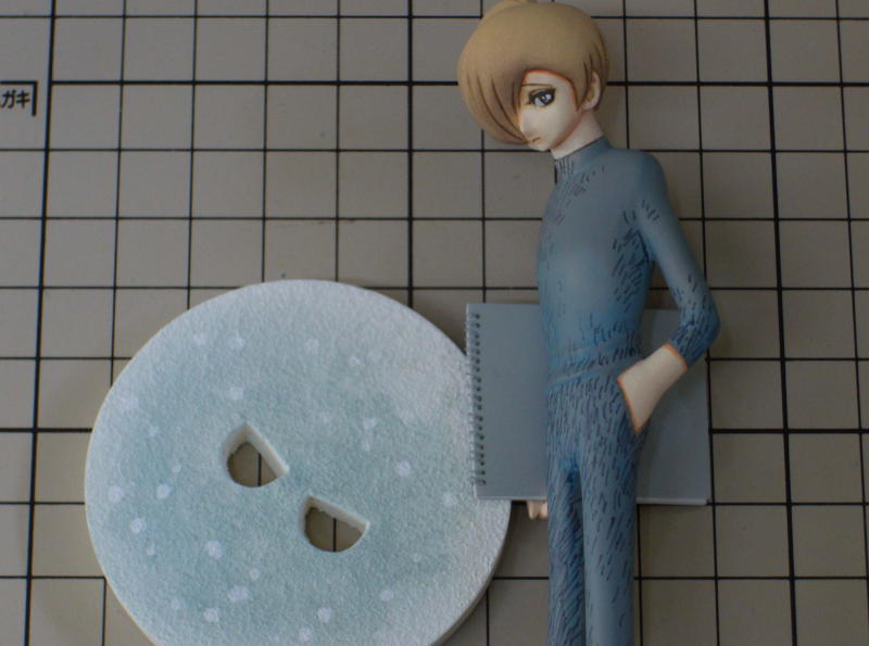 イラストでは足元が描かれていないので原作の中で天使が岩場で長話をするシーンを想定して台座を作りました。 色使いはイラストの背景(宇宙・星空)を足元に反映させたイメージで・・・真夜中、降り積もった雪、光る雪の結晶、といったところです。 |