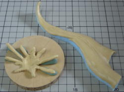スタイロホームで型を作り1o厚にのしたエポパテを押し当てて硬化待ち。 練ったエポパテが余ったので、台座用の水しぶきを作りはじめましたがエポパテの硬化が進んでボソボソになってしまいした。どうせポリパテ等で修正を繰返すので問題無いです。 |