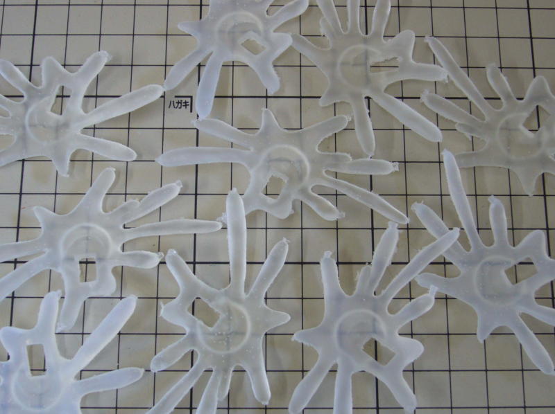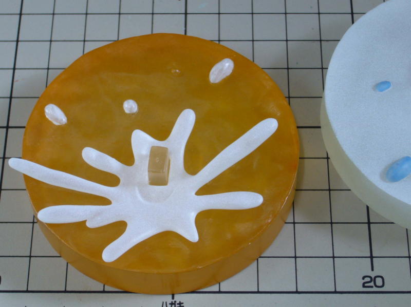 画像は透明レジンの水しぶき。 レジンの調合はデジタルスケールで量ってますが、湿度や気温で透明度にばらつきがでるし、レジンの中にはもれなく気泡が入ります。パーツは塗装することが前提なので「良」とします。 |