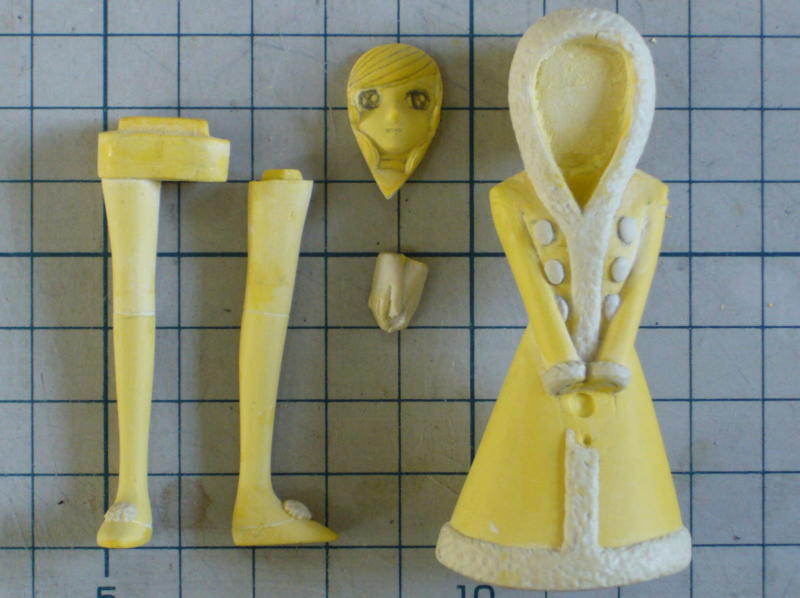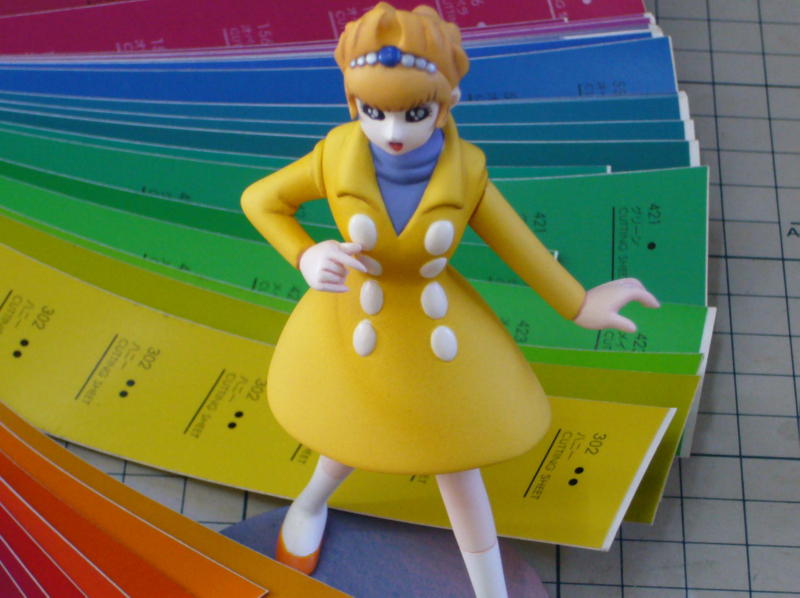 カッティングシートの色見本帳で色を選び調色。 塗ってみました。 ヘレンの服が地味に見えてきますね。 水色はムーンストーン、黄色はハニーという名前の色です。 |