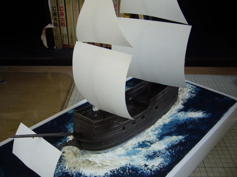 船の本体部だけレベルのキットを使い、マストをプラ棒、帆は画用紙です。発泡板でベースを組み、石粉粘土で波を作って色を塗りました。  一晩できっちり作りました。 |