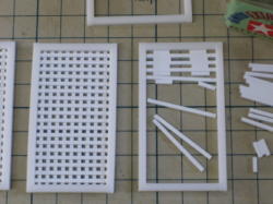 格子に使ったのは1.5o×1.5oの角棒。 タミヤのプラ棒には無いサイズなのでエバーグリーンのプラ材を取り寄せて使いました。少々大きな模型店でないと置いてない商品ですがヨドバシ.comにならあります! プラの模型材料と道具はほとんどカメラ屋さんでそろいますね。 |