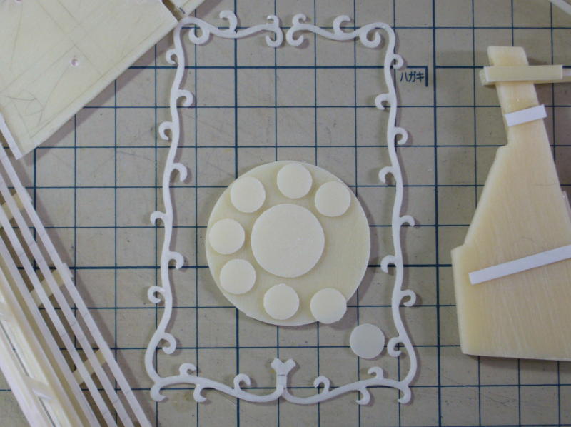 フレームがカットされた板と3o幅の板が20数枚とパーツの配置図のような紙切れが届きました。 フレームを組んで曲面に沿って板を貼ろうとして1枚目で断念。素人には無理です。エポパテをのばして貼り付けました。 「木」にはこだわらないんで・・・雰囲気は出てます。 |