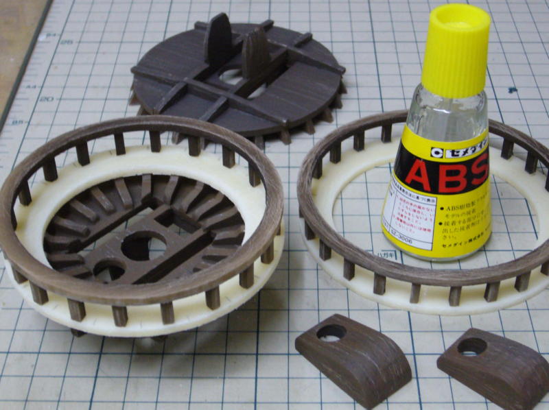 組んだ後では塗装しにくいところは色を塗りながらパーツを組み立ててます。接着剤は溶剤系を使うので、接着面は未塗装か紙ヤスリで塗料を削ってから接着。 ABS用接着剤はタミヤからも出てますがセメダイン社の方がサラサラで使いやすいです。 |