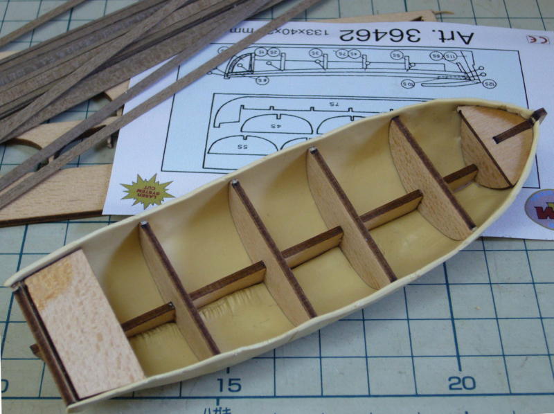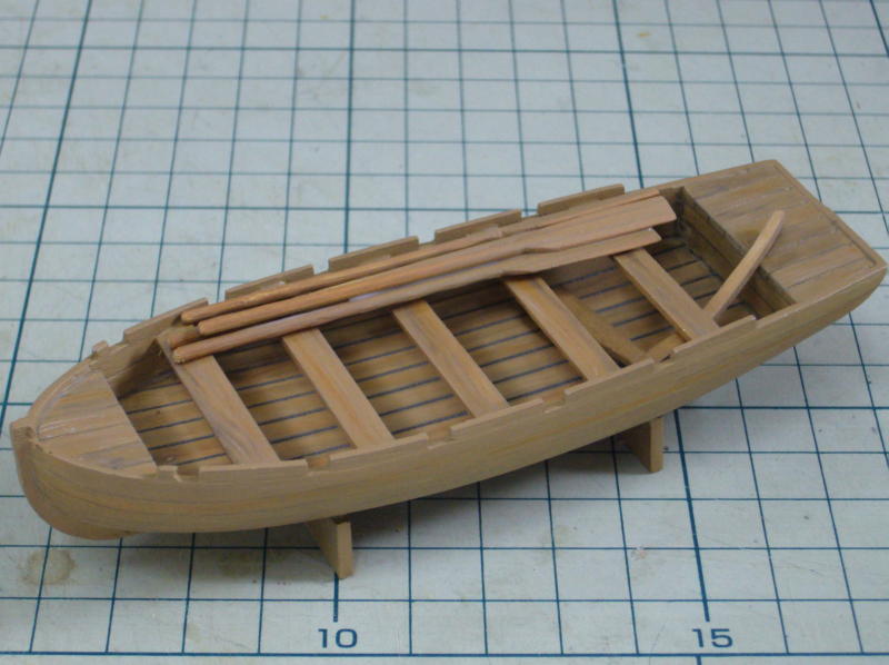 人生初の木製キットなのに結局プラ&パテ製になってしまいました。オールは木製です。 ボートは甲板上に置くので舵は取り外してます。 |