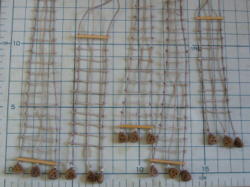 本来は完成した船に縦糸を張り、横糸を編んで作るのですが、制作時間短縮のため前もって制作。 取り付け後、きれいに縦横の目がそろうように縦糸に横糸を針で通して微調整がきくようにしてます。 大小14本、父親に制作依頼しました。 |