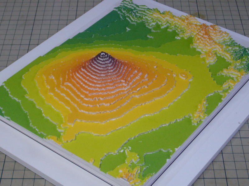 「地図模型」のサイトから頂いた原稿をスチレンボードに貼り、等高線に沿って切り出して貼り重ねていきました。 根気がいる作業で、七合目あたりまでがたいへんでした。 |