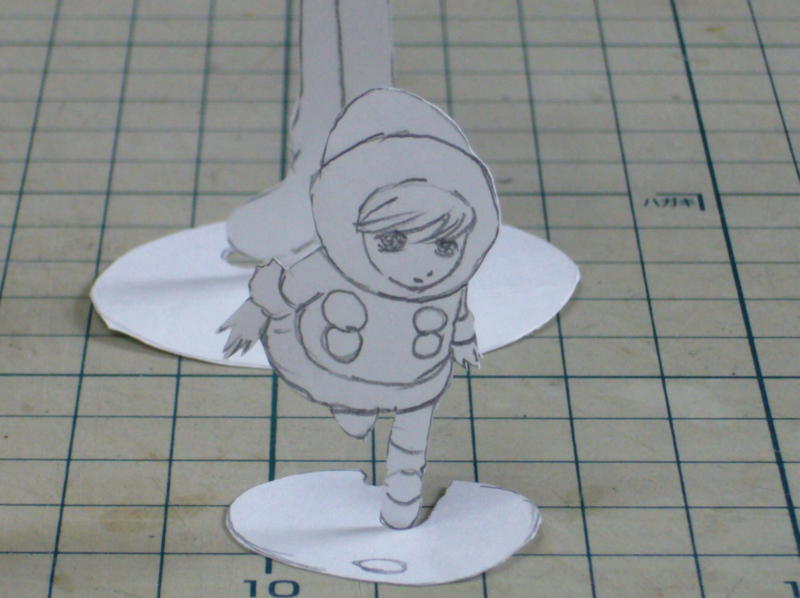 少々いびつに見えるのは、イラストの定規を使わないラフな線画を再現しようとプラバンをフリーハンドでカットしたり、表紙から中の画用紙をはみ出させてみたから。だと思います。 |