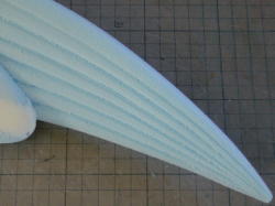 エポキシパテをひも状にして貼り付けようとしましたが太さが均一にならないし、ちぎれてしまうので練り直し。そば打ちの要領でエポパテを延ばし、カッターの刃で上から押し付けるようにカット。1.5o角の棒状にしたものを瞬着で貼り付け、硬化後ヤスリで断面が半円になるように削りました。 |