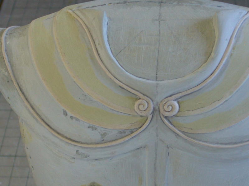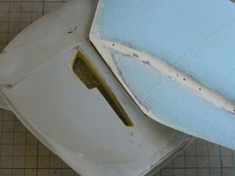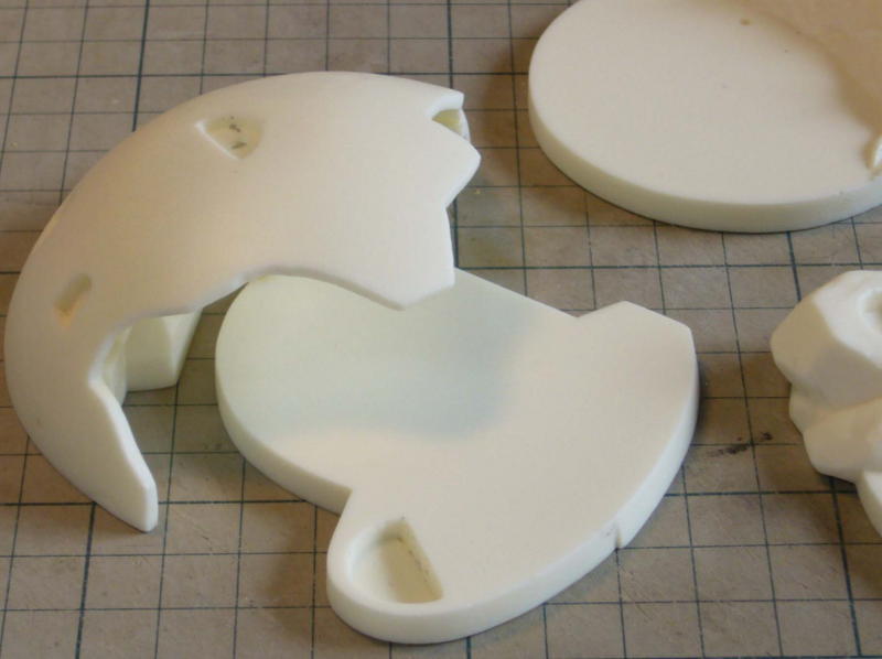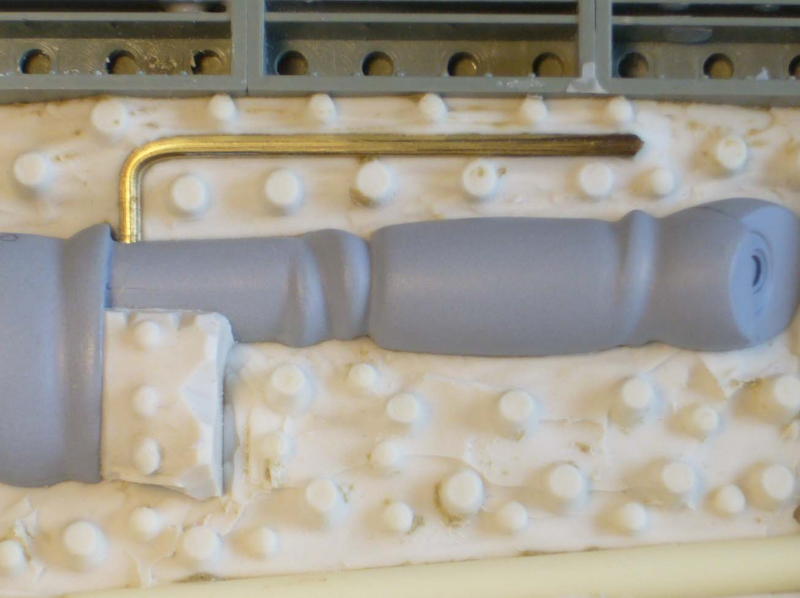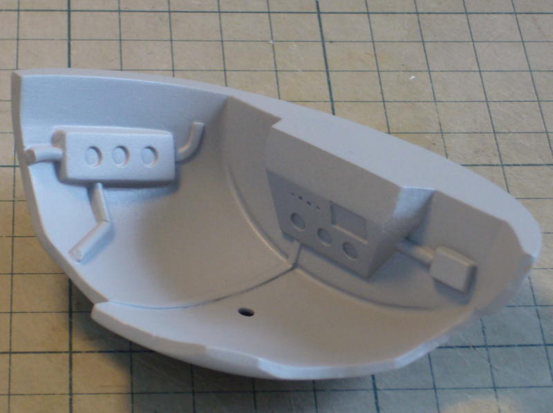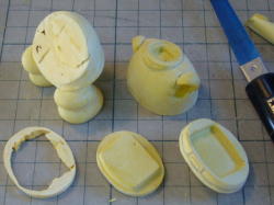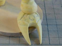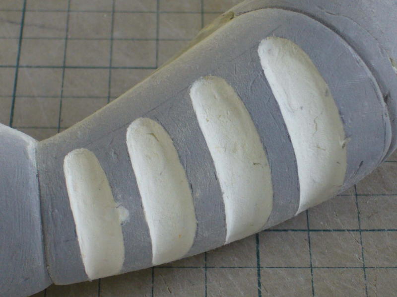 サフグレーを塗ってからデザインナイフで削り、金やすり、紙やすりで仕上げます。凹が白くなって形がわかりやすい。 完全硬化した石粉粘土はポリパテよりやわらかく削りやすいが、後々の表面処理が必要。 |