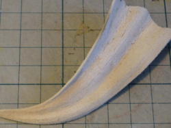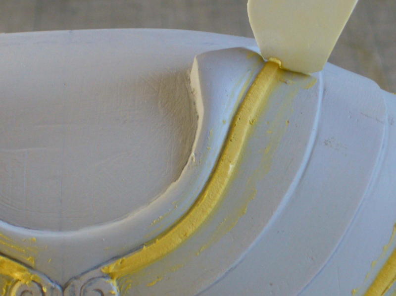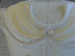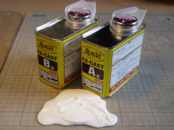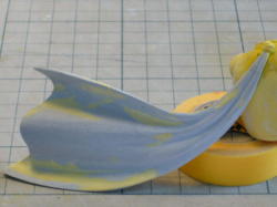 ポリパテをエポパテで作った帯状のモールドに盛り付けます。太めの断面の形を切り抜いたプラ板を、エポパテの上を余分なポリパテを削ぎとるようにスライドさせる。 思っていたよりきれいに太い帯が出来ました。 |