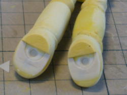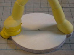 ポーズが変わらないように両足をプラ板に仮固定してからカット、ダボ加工、表面仕上げをします。 すべての作業が終わったらプラ板を外します。 |
