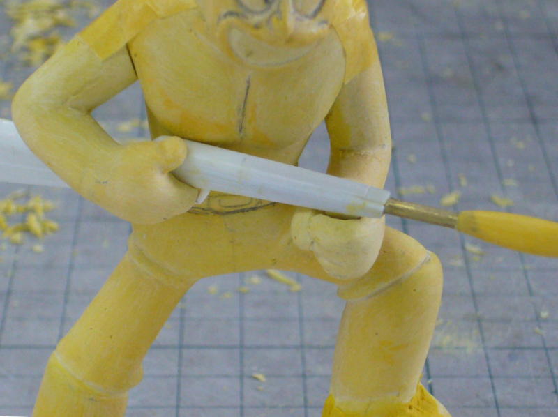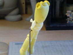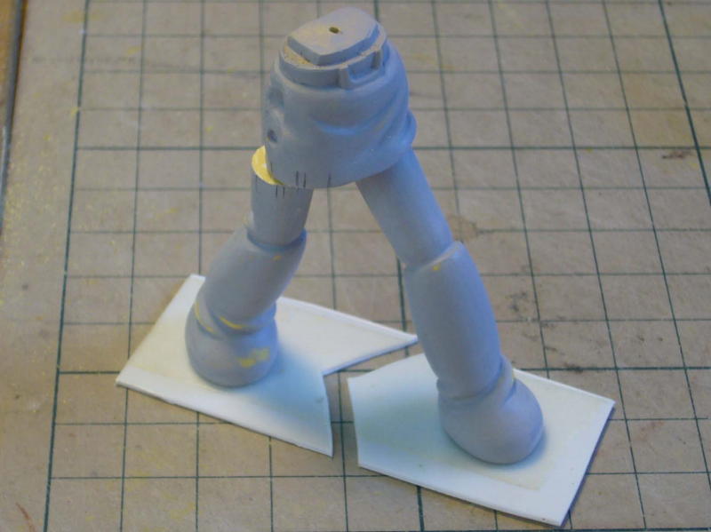 2分割にした下半身の凸ダボにポリパテを盛って上半身側に凹ダボを作りました。組んだりバラしたりが容易になり、これで作業がしやすくなった。分割というより、分離、合体という感じだ。 |
