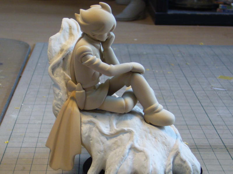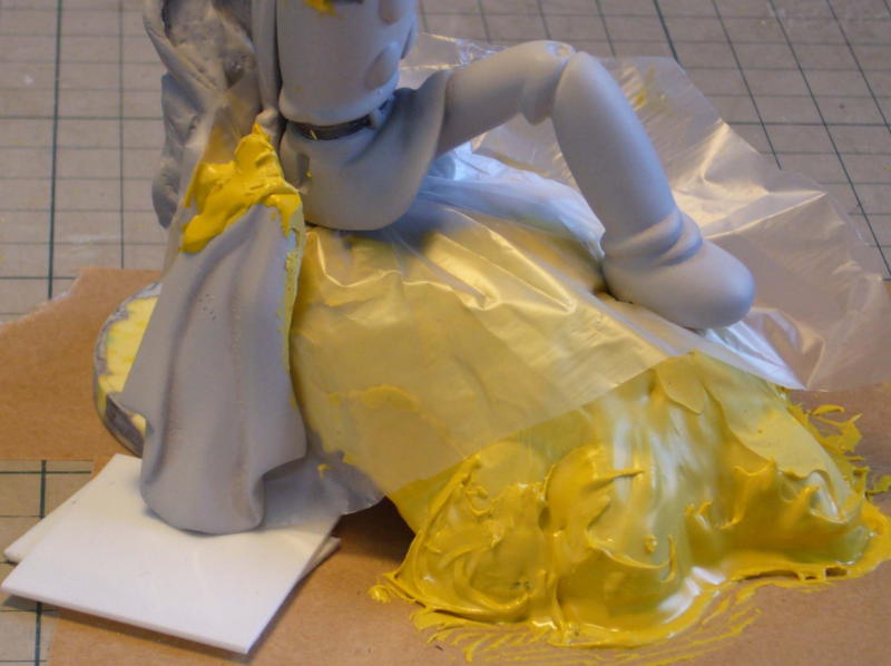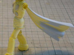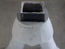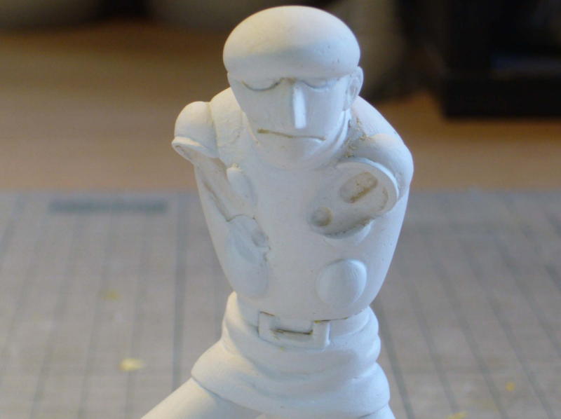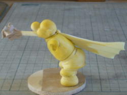 その上から薄く溶いたポリパテを塗り、硬化したら粘土をかき出します。台座に高さが出来たので、マフラーを腰の位置でカットして角度変更。イラストのように垂れ下がったマフラーを再現しまた。 |