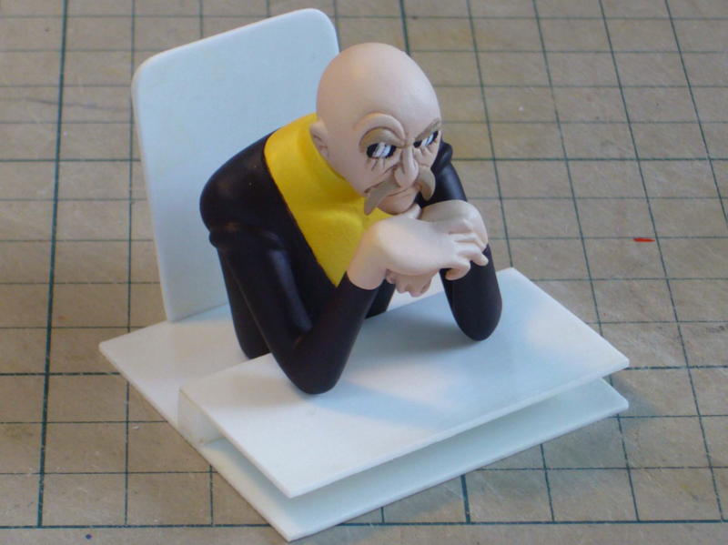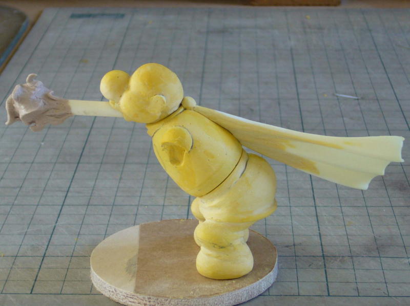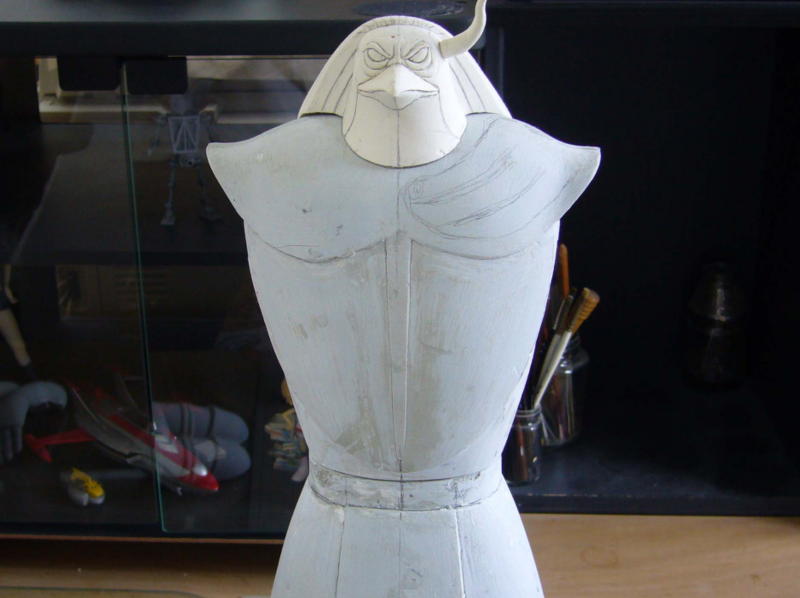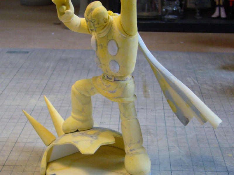 ポーズのバランスを考えたりマフラーの向きを考えたりします。 現状では飛ばせないジェットは後方で寝てます。 土偶版ギルモア博士も添えてみました。 |