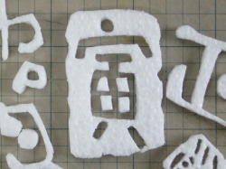 カクカクしたキャラなので、一度ボール紙で試作してからプラ板を箱組みして作りました。 画像はその一部。 浮き出た文字はエポキシパテを盛りつけました。 |