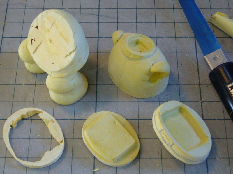 上下パーツの断面のゲージになり、硬さは削りすぎ防止になります。 図面から各パーツを切り出し組み上げていく建設的な作業は楽だし楽しい。 |