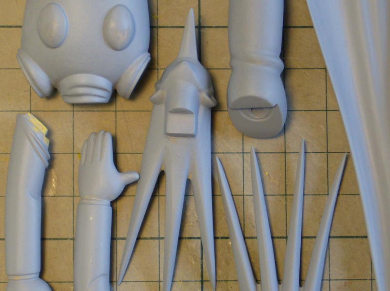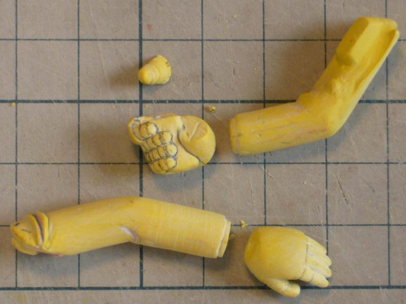 ヨミ編ではマシンガンを意味するラインが両手の指に入ってますが、原作に色が付いてないことをいいことに、このラインを右手はマシンガンモールド、左手は電磁ナイフ仕様の関節モールドと解釈して制作。 仕上げ作業のはずが、だんだんパーツがバラバラになる。 ふしぎだ・・・ |