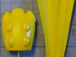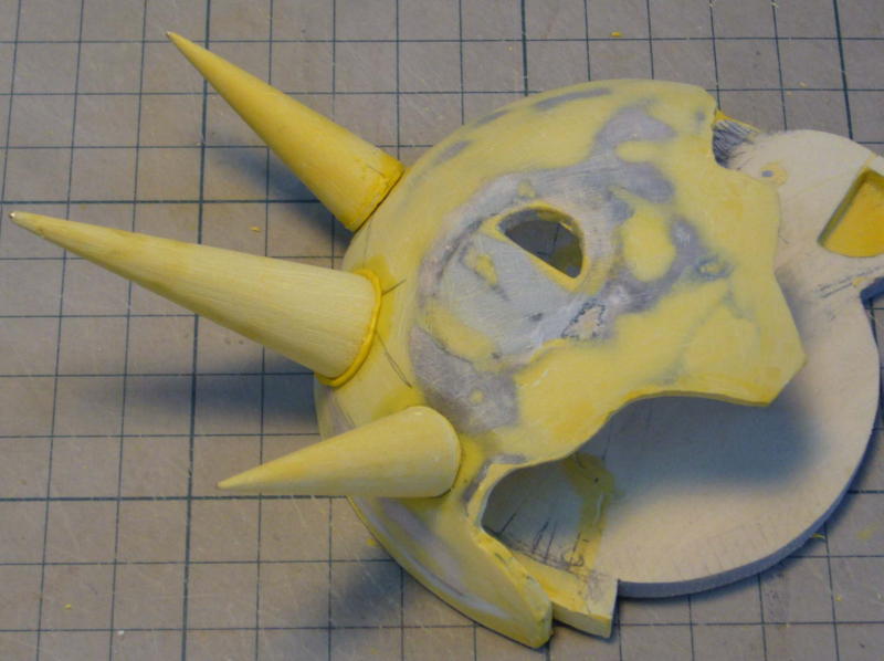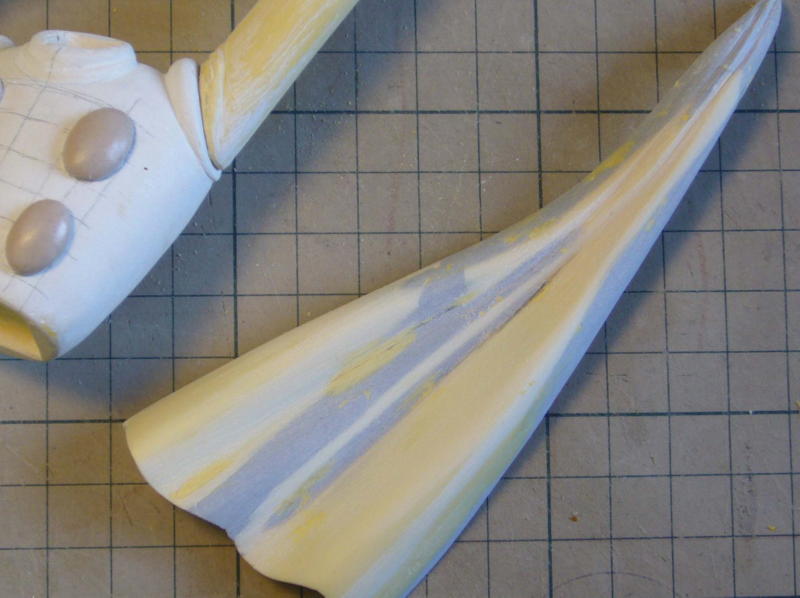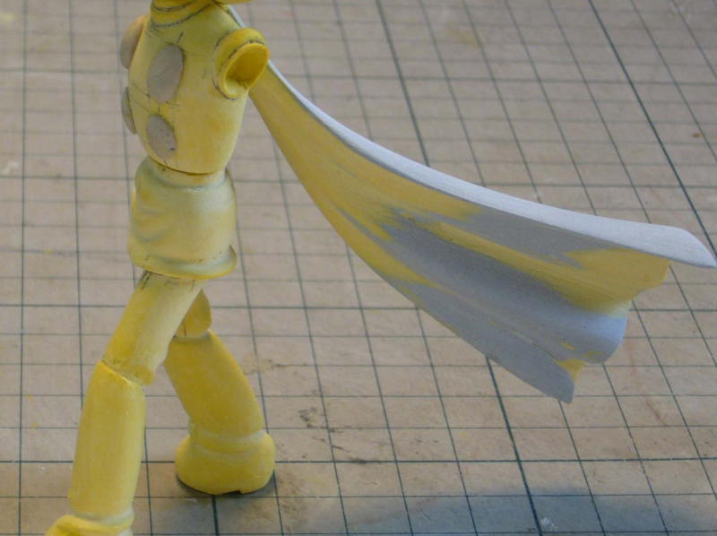パテとサフで下地を整えたら、彩色はいつものように黄色から塗り始めます。 ボタンをツヤ有り、マフラーをツヤ消しで吹き付け塗装。 |