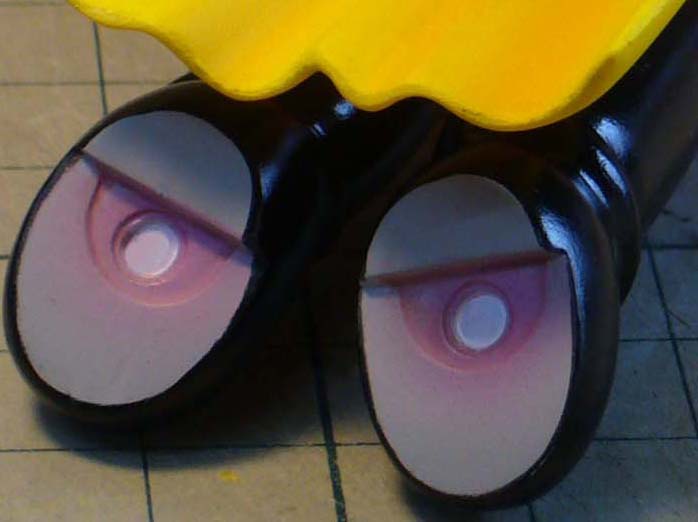 ラッカーで着色。目の中のラインはボールペンで描きました。 椅子の後の球体はどうしょうか・・・作るか、描き割りか、フォトショか、無視か。 |