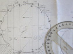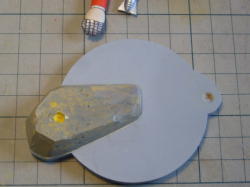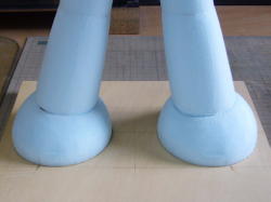 5.5o厚のシナベニヤを電動糸ノコで円形に切り出します。 片足の接地面が高くなってるのでポリパテで段差をつけました。 |