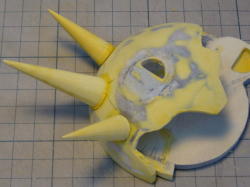 ベニヤの切り口をラッカーパテで目止めし、乾燥後ヤスリがけできれいな面を出します。全体にサーフェイサーを吹き付け、乾燥後ヤスリがけして仕上げます。 片足が乗っかる岩はポリパテを盛って作りました。 |