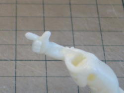 支持棒と同じ太さの真ちゅう棒を原型に差し込んだまま型取りして、複製したレジンのパーツにも同じ取り付け穴を作ります。 |