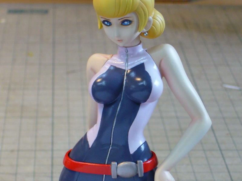 髪の色はイラストを参考にベージュ系で塗り、他はいつもの配色です。 極小ボタンの塗り分けではマスキングもれが多発。極細面相筆で修整しました。 台座を除いて完成! |