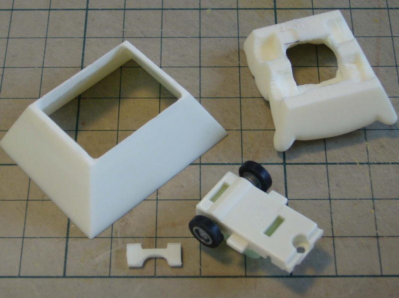 チョロQのシャーシを仕込むため、ノコとルーターを使ってスペースをつくりました。 シャーシは前後をカットしてぎりぎり小型化。 |