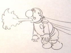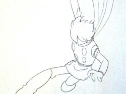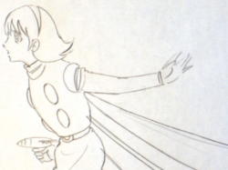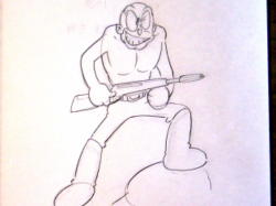 ヨミ編の中で17回くらい、ほとんどギャグのために変身(変形)能力を使ってますが、それを表現すると別のモノになってしまうので非常に困ります。ラフ画は004を助けに駆けつけたときのコマを参考に描きました。上半身裸なのは上着を脱いで上半身だけ透明人間になったあとだからです。 苦しいですけど、変身能力のなごりということで。 |