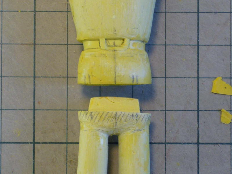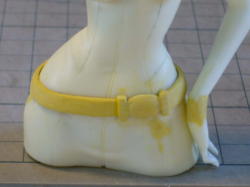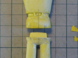 腰で2分割し着脱用にダボを付けます。下半身の斜線部を削り、離型剤を塗ってから上半身を合わせ、ポリパテでスカートをはかせます。 「skirt=すそ」、なのでスカートと呼んでいいと思います。 |
