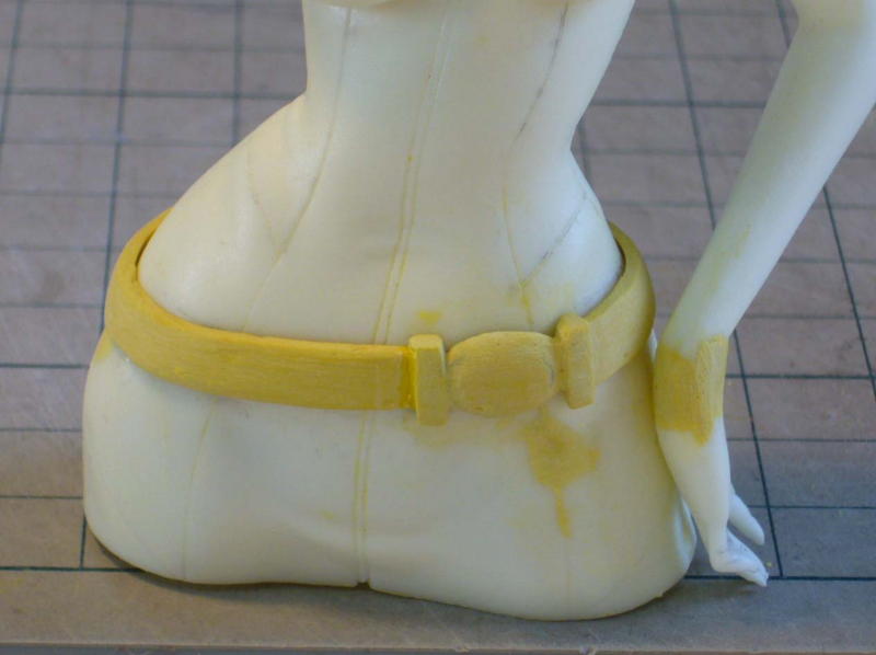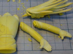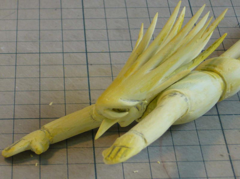 ボディーにリップ(離型剤)を塗ってからポリパテを盛り、 ちょうど加工しやすい硬さになったらデザインナイフで形を作っていきます。 ベルトに合わせて左の手首と指の角度を変えてみました。 |
