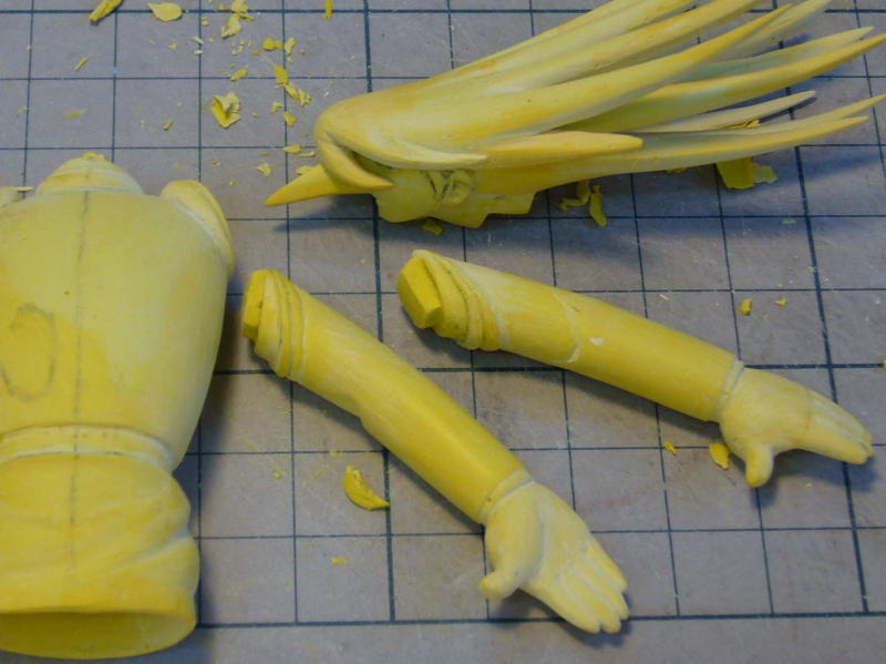 各部のボリュームはほぼそのままに、イラストを参考にポーズ変更。 右腕はこの角度の方がかっこいいなぁとか、左手はグーにしようとかパーにしようとか、イラストにとらわれずポーズ変更。 |