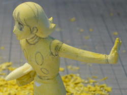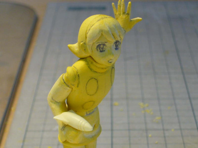 1/15の原寸大に縮小コピーしたイラストをガイドにポーズの変更。頭部が大きすぎるので一回り小型化。髪型もかなりショートにしました。 |