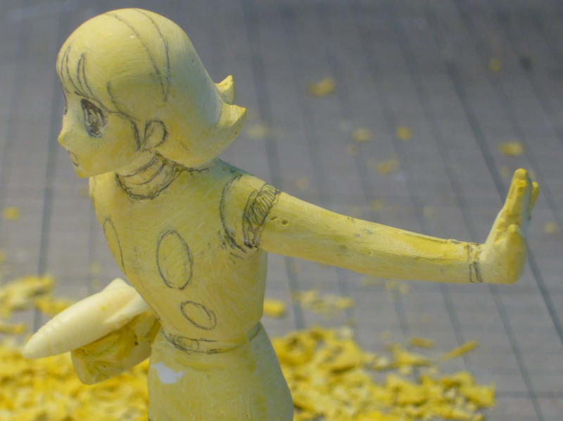 彫刻刀とデザインカッターで髪の流れを彫っていきます。 |