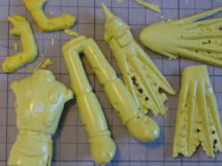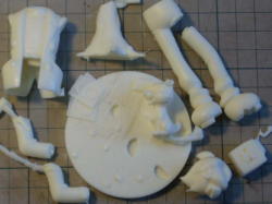さっそく仮組みをしようと思ったらマフラーが無い。 複製をし忘れたんじゃなくて型取りを忘れた。しかもマフラーの原型が見当たらない。年末の大掃除で捨ててしまったらしいです。 もう罰が当たった。 |