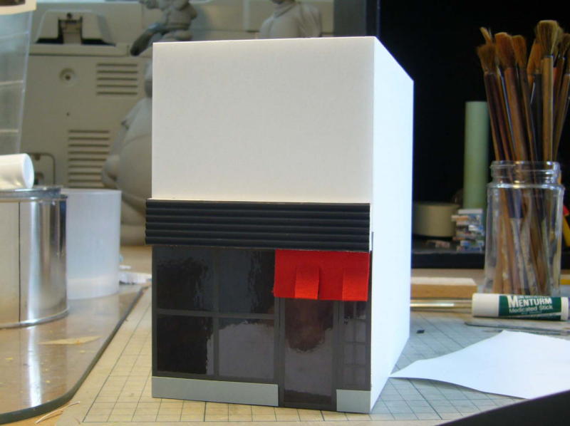 スチレンボードの箱組みに色紙やシートを貼って仕上げてます。 その中の1軒を連ドラ『流星の絆』に出てくる洋食店アリアケ風にしてみました。 |