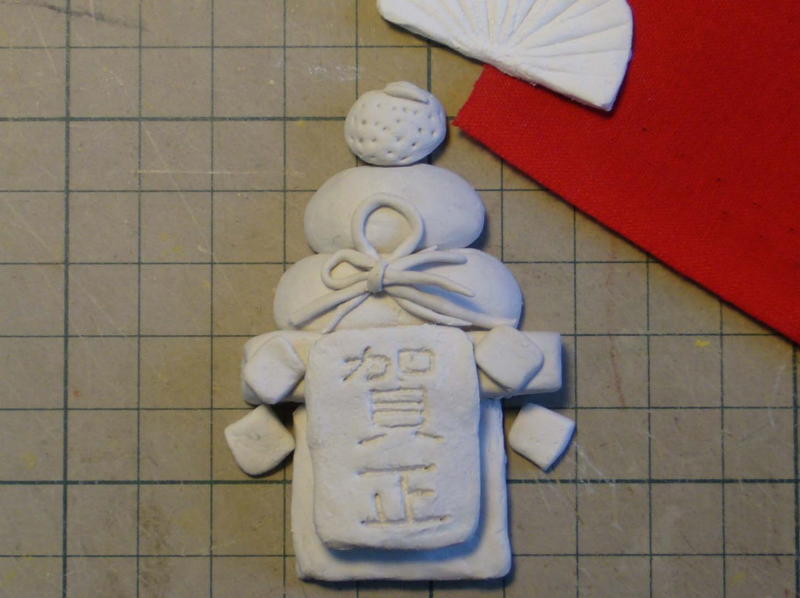 紙粘土を練って1時間半でお餅完成。 アリアケで使った赤い布を敷いて、デジカメ撮影10分。 フォトショでちょっといじってプリントアウトが2時間。 手間がかかってるように見えるけど実際はこんなものです。 |