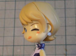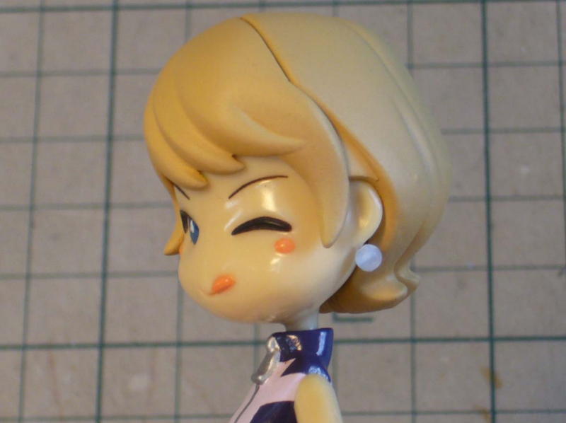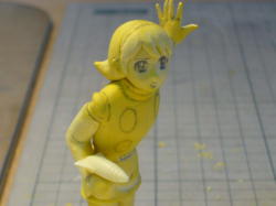 髪。ミレーヌの頭部にポリパテを盛って髪型を変える。 顔。ペイントで目を変えればいいと思っていたけど目元をパテで整形したほうがいいようです。頬からあごのラインはミレーヌよりシャープな印象。 |
