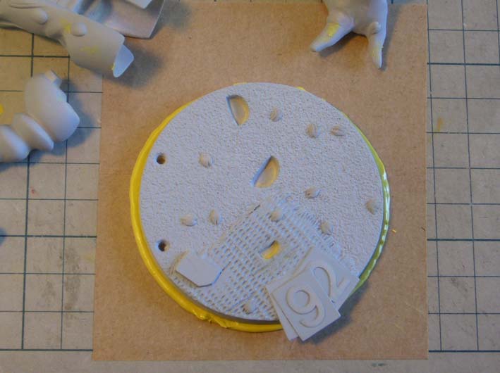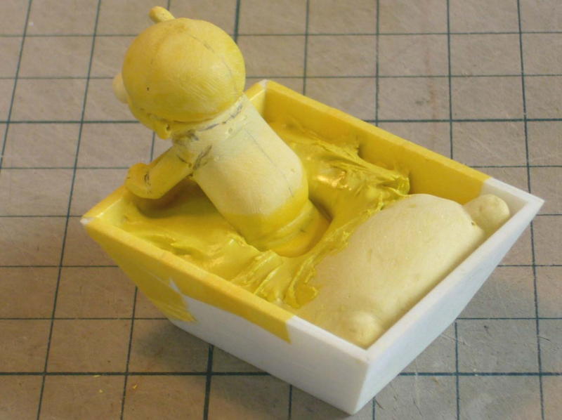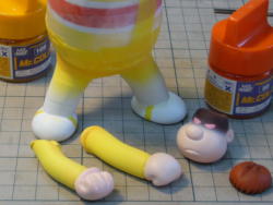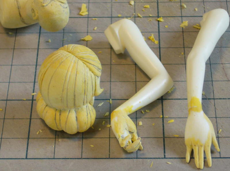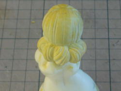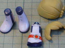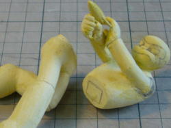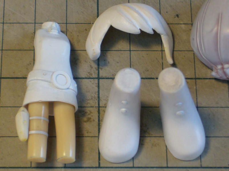 足は左右の間にスペースが無く成形しにくいので片足を別パーツとしました。 頭部は前髪を別パーツにするため、カチューシャからおでこまでの部分をカット。カットしたところにリップクリーム(離型剤)を塗り、ポリパテを盛って前髪を作りました。 |