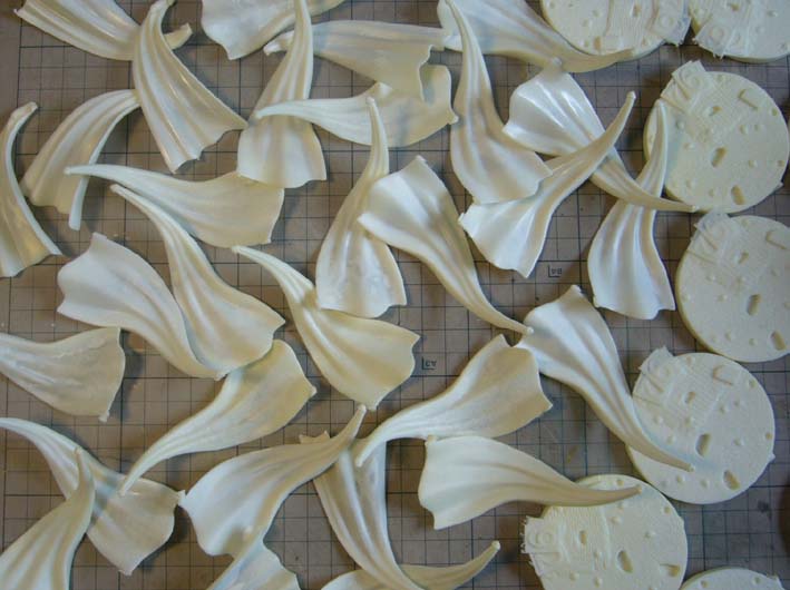 花びらの型が壊れたので新規に作りました。 いつもの2面取りではなく真ちゅう線を付けた原型をまるごとシリコンに沈めます。シリコン硬化後、カッターで原型を掘り出すように2分割。切り口は凹凸を付けてダボがわりにします。成型は『たいやき方式』で。 小物や単純な形状のモノ。WF直前、WF2日前のときは有効な技法です。 |