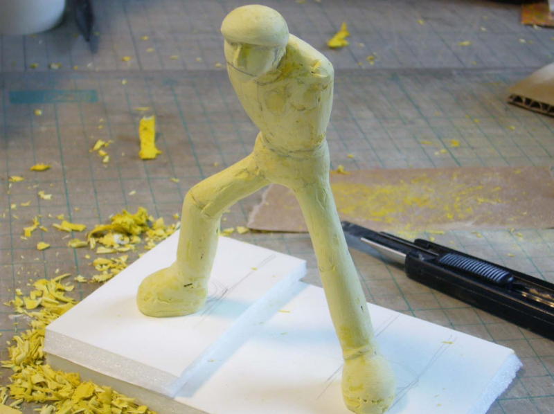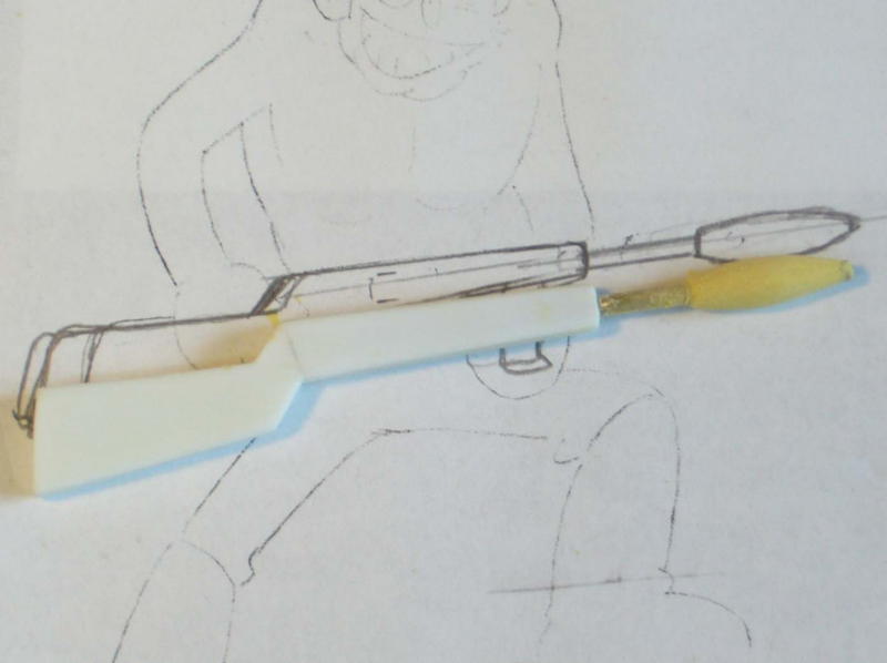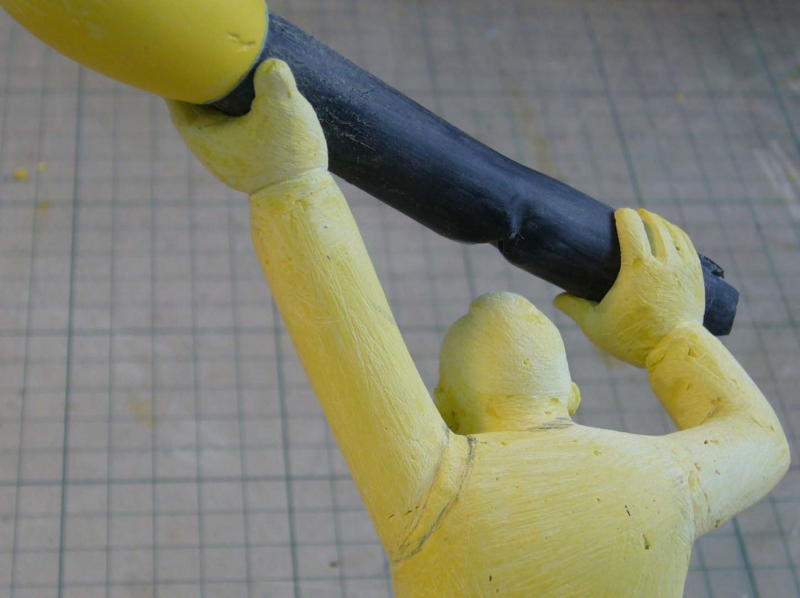 土偶版の左右の手が、銃を構えるのにちょうどいい形をしているのでそのまま採用。この段階では雰囲気が分かればOKなのです。 脚は・・・やはり長いか・・・胴が短いのかぁ? |