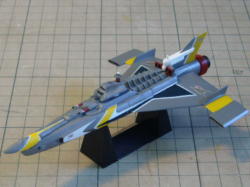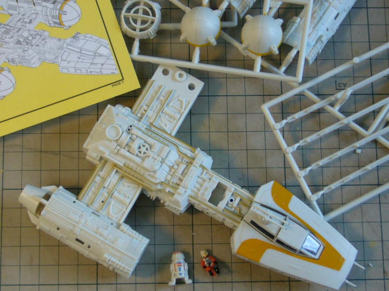 でっかい箱を開けると、中身は半分も無いのにまずびっくり。 50分で完成。全長219o。スケールは1/73くらいでファインモールドのより小さいです。出来が「?」なんだからせめて大きさで勝ってほしかった。 完成済みのパイロットとR5-D4はなかなかいいです。 |