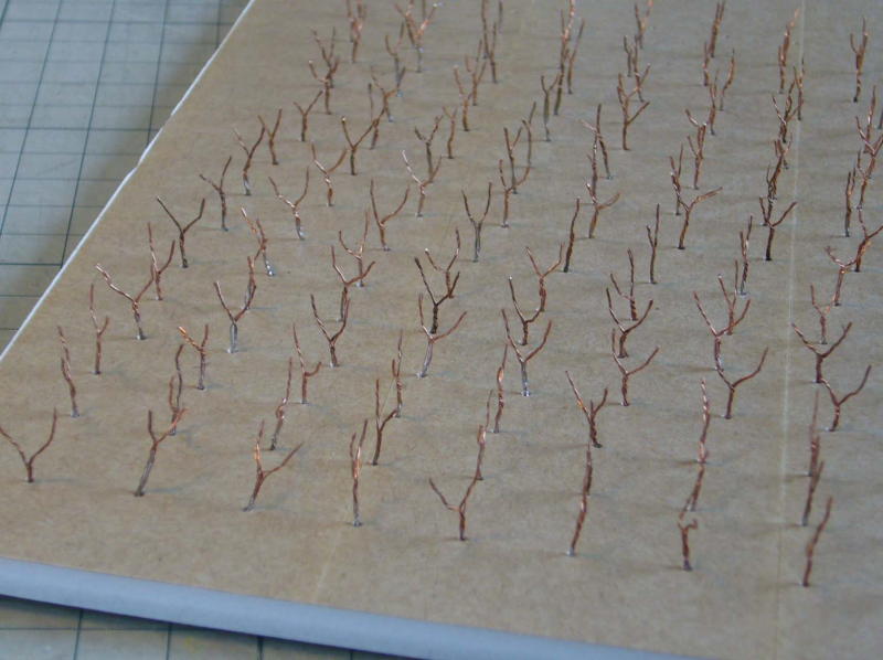 電気コードの銅線をねじってY字のような木の幹、枝を作ります。高さで15oくらい。 ねじってねじってねじって200本。 後遺症で、まだ指が変です。 茶色に塗装後、緑のスポンジを接着して完成。 |