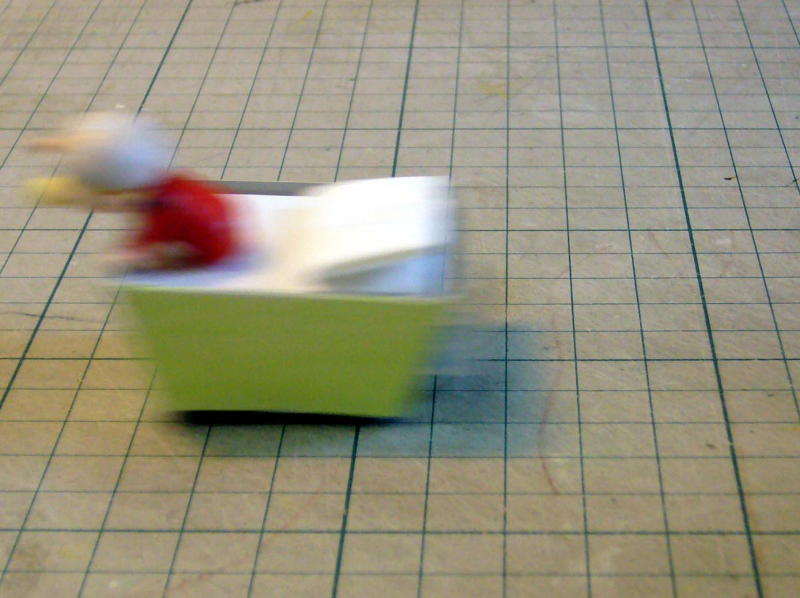 いい走りです。暴走気味ですけど。ウィリーもします。 ゆりかごはヨミ編のものをレジン複製して使おうとしましたが、シャーシ(チョロQのメカ部)が意外と大きく収まりきれなかったので、一回り大きいゆりかごをボール紙で作りました。 |